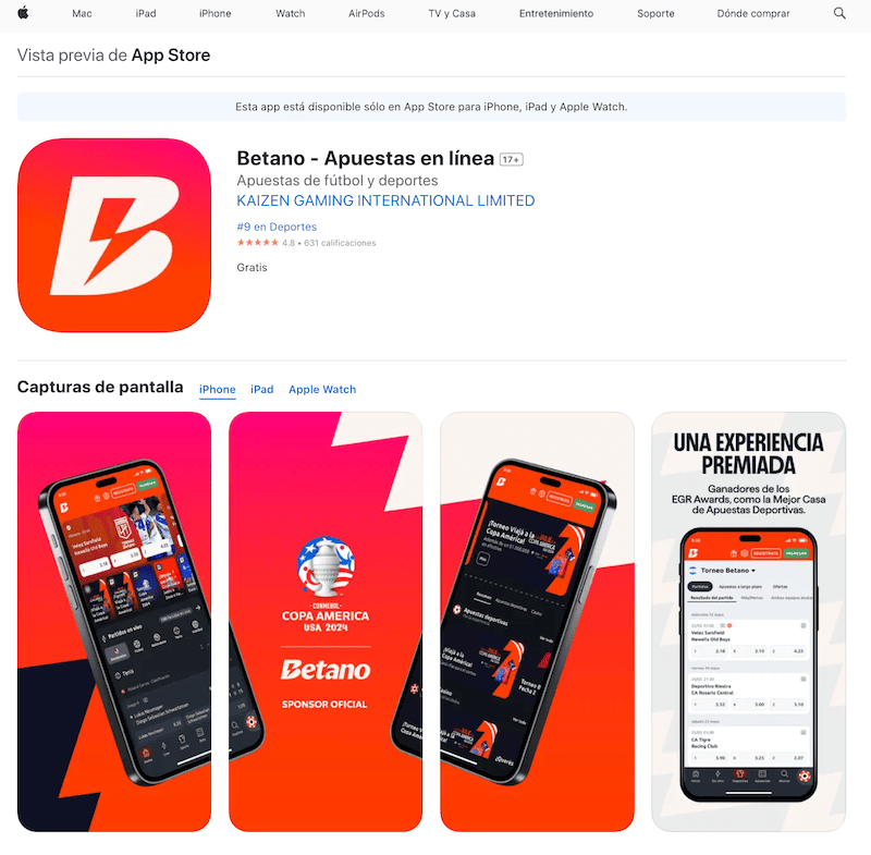 Algo que nos llamó la atención a la hora de descargar la aplicación de Betano en nuestro iPhone de pruebas, es que en apariencia no existe una app para IOS, no obstante, en cuanto la buscamos en Google fuimos redirigidos a la App Store y pudimos completar la descarga.