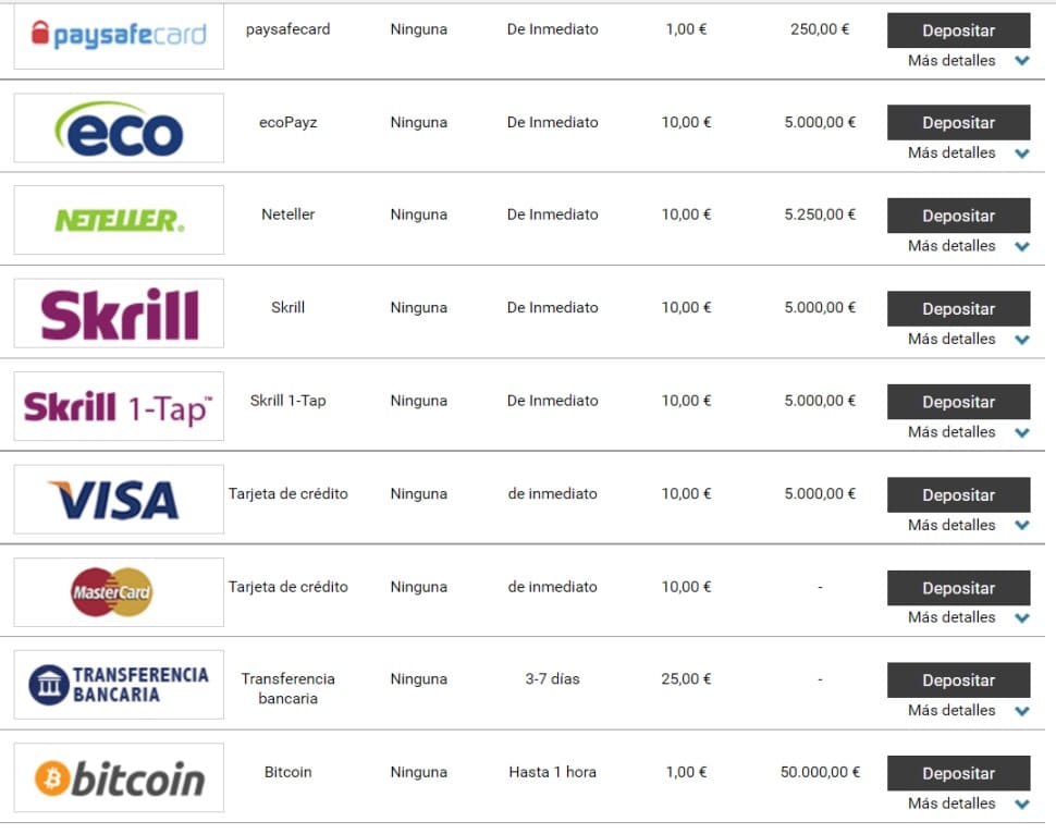 Comencemos por mencionar que existe la opción de usar tarjetas avaladas o con el sello de VISA y Mastercard, además de otras tarjetas (aunque es una opción que no nos quedó muy clara), también permite que uses las opciones populares en esta industria que son Neteller y Skrill, sin olvidar a Ecopayz, la Paysafe card, la cuenta digital de Todito cash, Much Better, las tarjetas American Express y hasta Bitcoins, así que no hay un pretexto en ese sentido para que no agregues saldo pronto, para de paso obtener el beneficio del código de bonus Rivalo Ecuador.